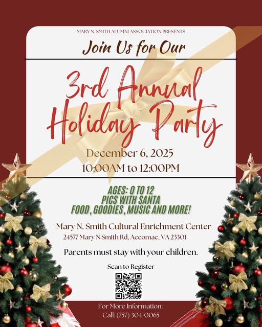 We invite you to our 3rd Annual Holiday Party on Saturday, December 6, 2025 from 10:00 AM to 12:00 PM at the Mary N. Smith Cultural Enrichment Center. This free community event is open to children ages 0 to 12 and will feature pictures with Santa, food, goodies, music, and more. Parents must stay with their children! Don’t miss this festive celebration filled with holiday cheer! For more information, scan the QR code on the flyer or call (757) 304-0065.